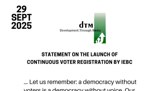 PRESS STATEMENT FOR IMMEDIATE RELEASE 29 September 2025 Statement on the Launch of Continuous Voter Registration by the IEBC Nairobi, Kenya — Development Through Media (DTM) welcomes the announcement by the Independent Electoral and Boundaries Commission (IEBC) on the commencement of Continuous Voter Registration today, Monday 29th September 2025. This is not just an administrative exercise — it is...