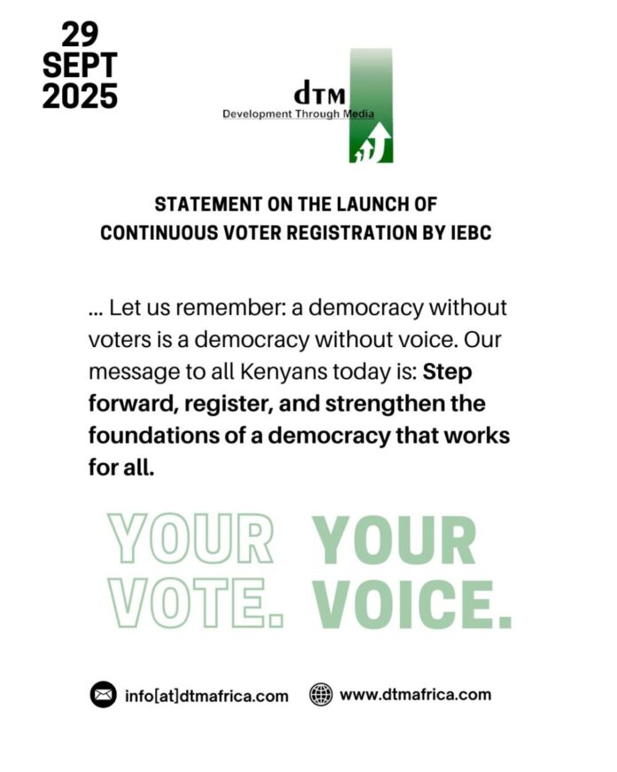 Nairobi, Kenya — Development Through Media (DTM) welcomes the announcement by the Independent Electoral and Boundaries Commission (IEBC) on the commencement of Continuous Voter Registration today, Monday 29th September 2025.