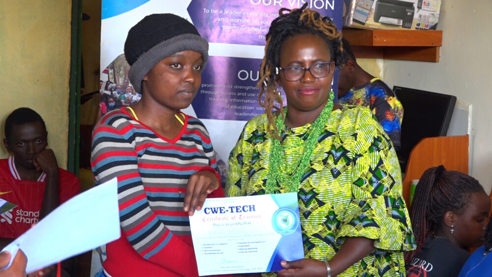 Judy Makira awarding a certificate to Stella Kabura after completing the basic computer skills course. Photo/ Rebecca Wangari.